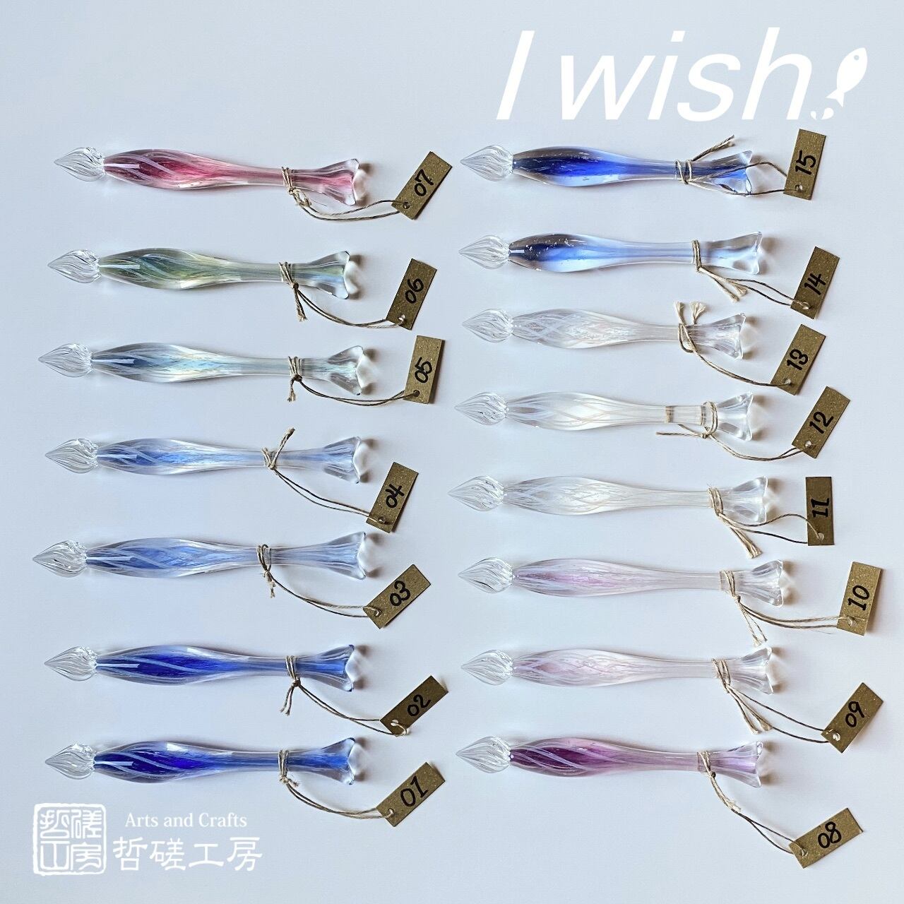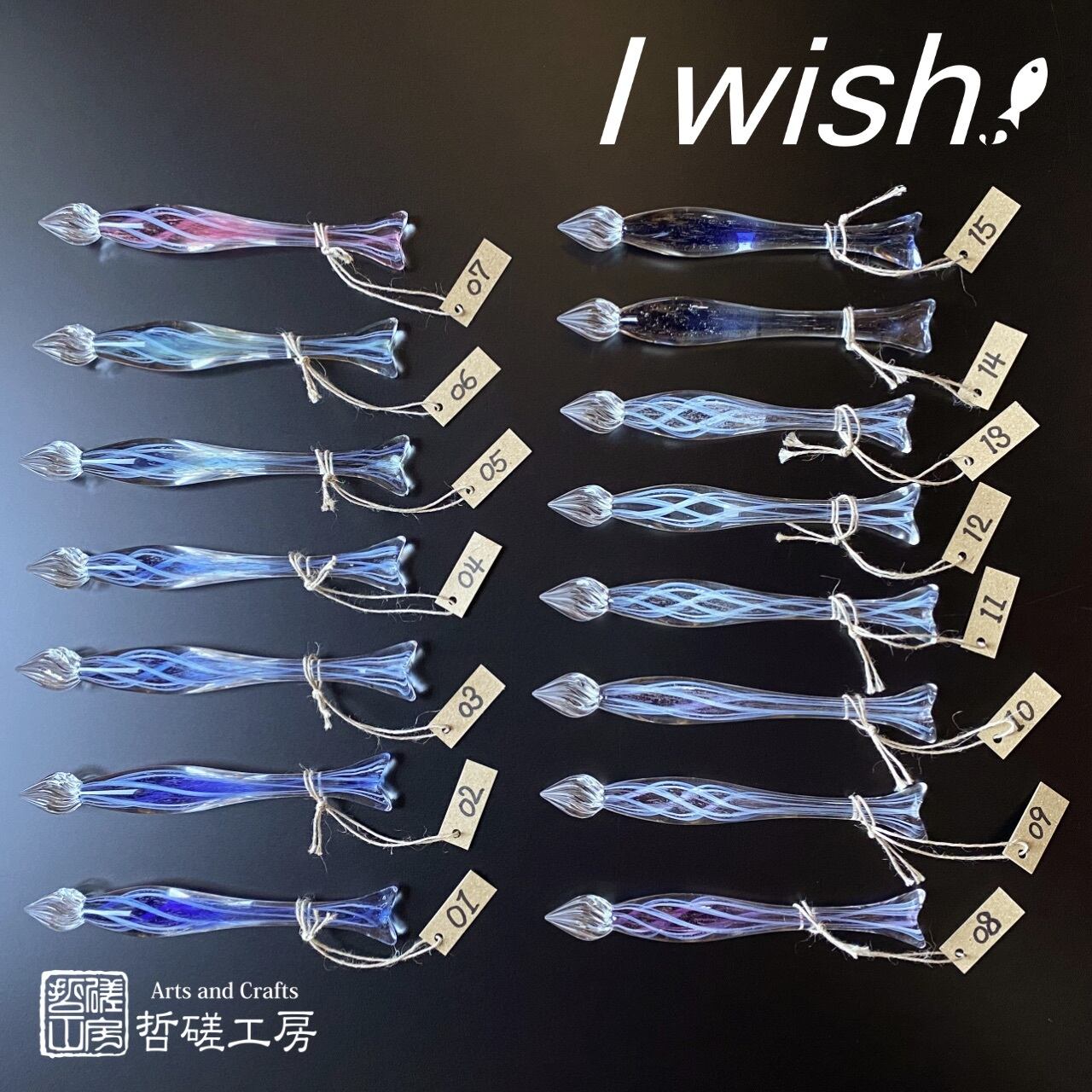 百花繚乱のインクの海を悠々と泳ぐお魚型ガラスペンです。